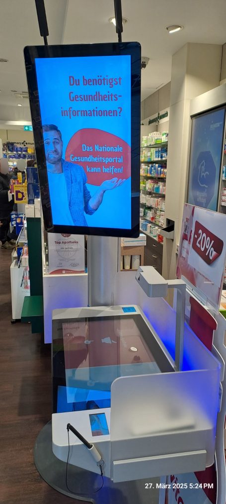 Auch Wissensvermittlung spielt eine zentrale Rolle: Medikationshinweise, Beipackzettel, ICD-10-Codes oder digitale Gesundheitsinformationen werden direkt am Terminal abrufbar. So entsteht ein ganzheitliches Informationsangebot, das Patientinnen und Patienten selbstbestimmt nutzen können.